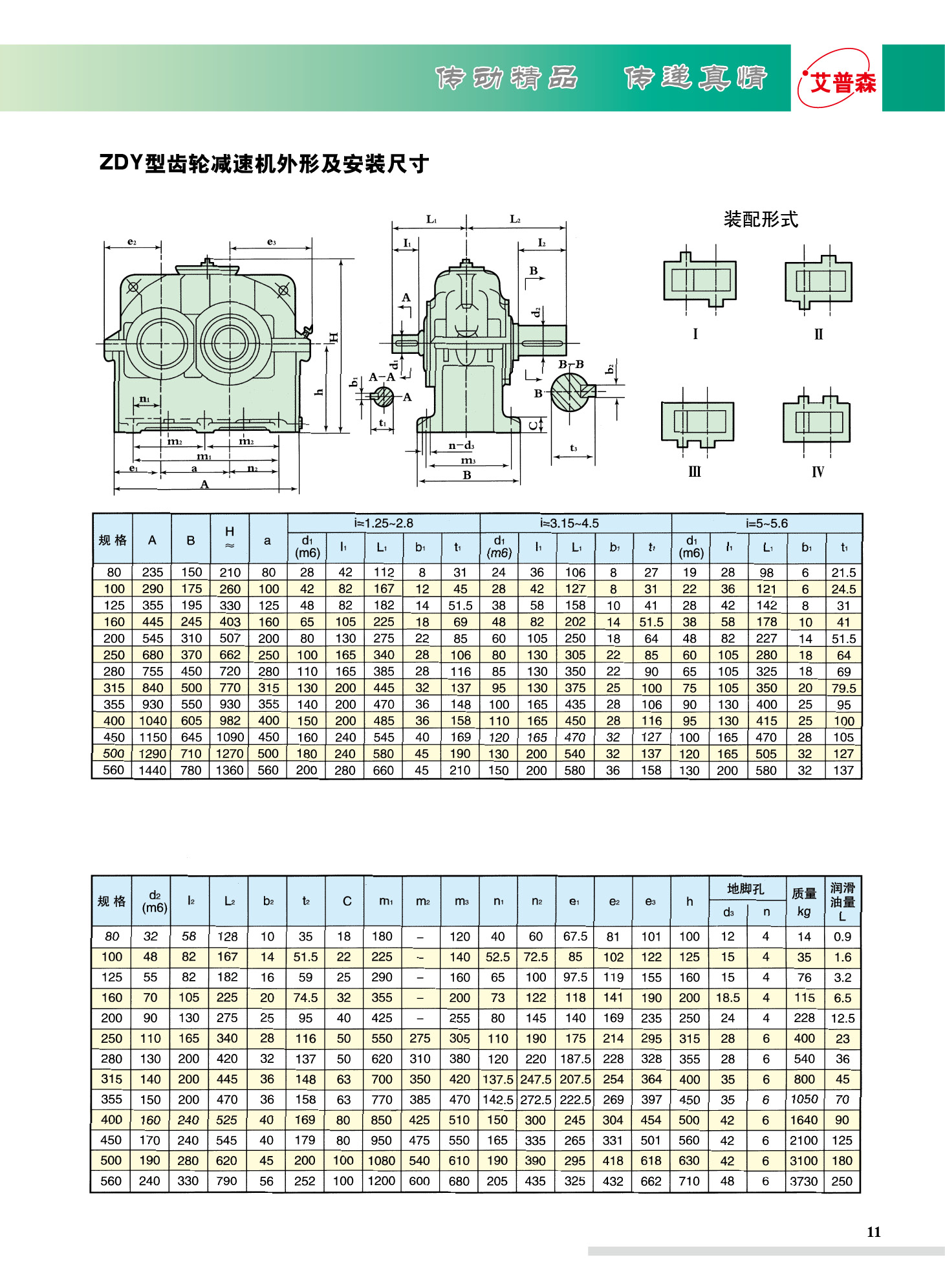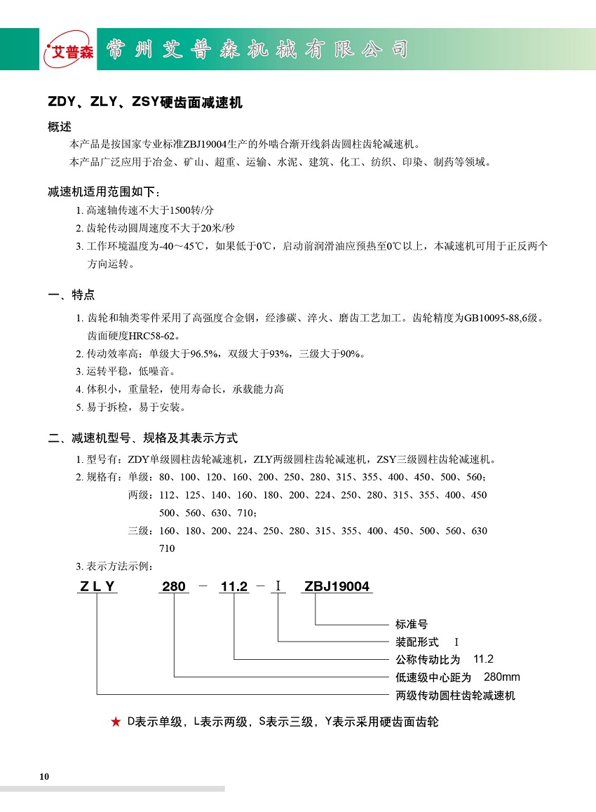 ZDY/ZLY/ZSY圓柱齒輪減速機減速機適用范圍如下: 1、高速軸轉不大于1500轉/分。 2、齒輪傳動圓周速度不大于20米/秒。 3、工作環境溫度為-40~+45℃,如果低于0℃,啟動前潤滑油應預熱至0℃以上,本減速機可用于正反兩個方向運轉。 一、特點 1.齒輪采用高強度低碳合金鋼經滲碳淬火而成,齒面硬度達HRC58-62,齒輪均采用數控磨齒工藝,精度高,接觸性好。 2.傳動率高:單級大于96.5%,雙級大于93%,三級大于90%。 3.運轉平穩,噪音低。 4.體積小,重量輕,使用壽命長,承載能力高。 5.易于拆檢,易于安裝。 ZSY三級圓柱齒輪減速機規格型號有:ZSY160.ZSY180.ZSY200.ZSY224.ZSY250.ZSY280.ZSY315.ZSY355. ZSY400.ZSY450.ZSY500.ZSY560.ZSY630.